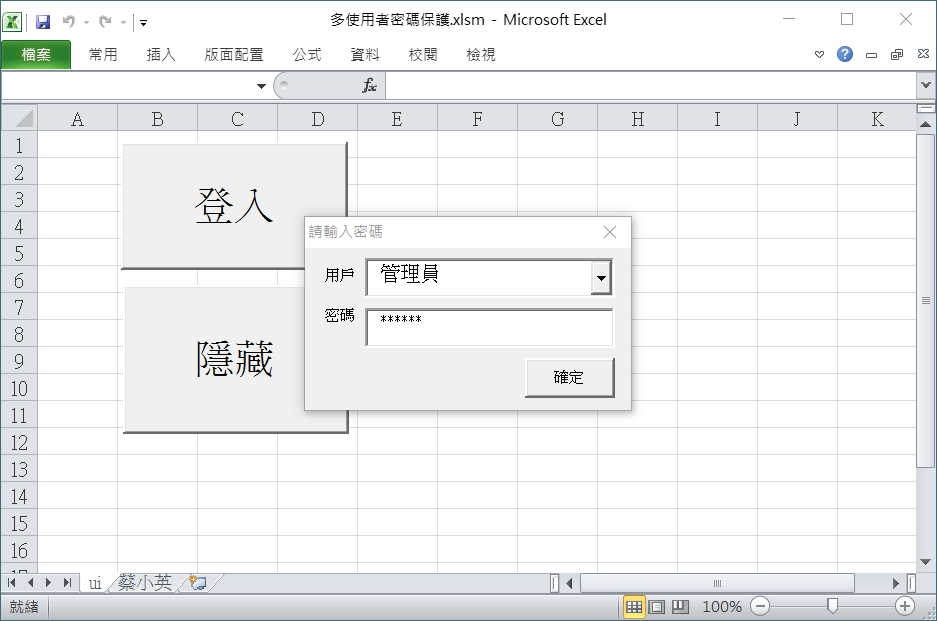 當我們按下【登入】按鈕時,首先會跳出一個帳號密碼視窗,這個我們稍後再談。當取得帳號密碼後,就會跟 “passwd” 活頁簿裡的資料比對。符合的話,就會解除隱藏以該用戶名稱命名的活頁簿。