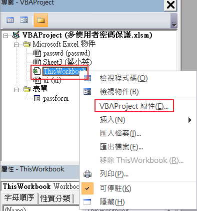 避免被破解的第一步,就是要把避免VBA的程式碼被修改移除。要將VBA程式碼保護,只要在 VBA 專案視窗內的選取工作表的屬性,就可以設置密碼了。