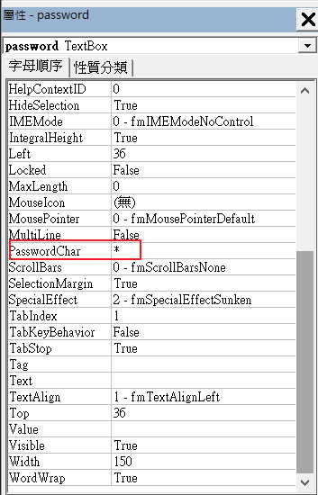 為了讓密碼欄在輸入時顯示星號,需在其屬性欄位輸入一個星號,就可以了。