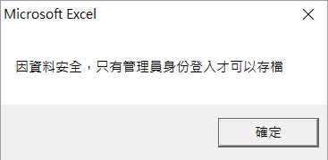Private Sub Workbook_BeforeSave(ByVal SaveAsUI As Boolean, Cancel As Boolean) Dim password As String Dim user As String user = "管理員" password = passform.password.Text '比對最後登入的帳號是否為管理員 If ui.PasswordVerify(user, password) = False Then '如果不是管理員,又是另存新檔,則跳出警示禁止存檔 If SaveAsUI = True Then MsgBox "因資料安全,只有管理員身份登入才可以存檔" Cancel = True End If End If End Sub |