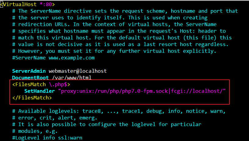 首先要修改設定檔,將站台的 .php 處理功能指向 php-fpm,如果是使用 http 的請編輯/etc/apache2/sites-available/000-default.conf,https 請編輯 /etc/apache2/sites-available/default-ssl.conf,然後加入以下設定: