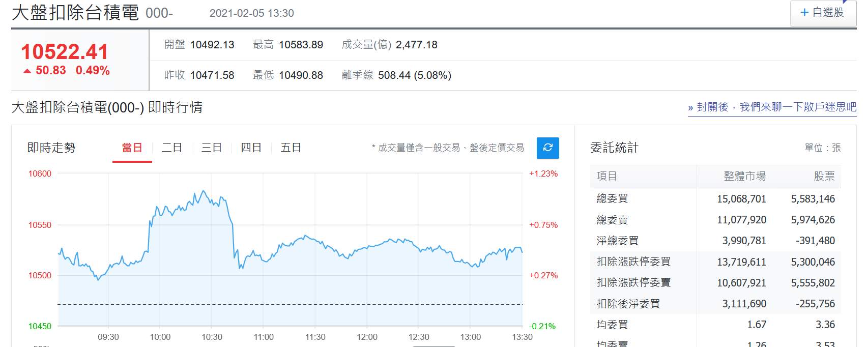 由於2020年以後台積電已經變成權值巨獸,光看大盤指數,和其它類股票其實已經脫勾了。所以就有人建立了扣除台積電的走勢圖,可以更瞭解其它產業走勢。