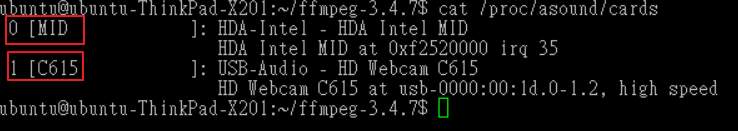 若要使用簡單一點的點對點傳輸,可以直接把編碼後的資料,傳給指定的 IP:Port,這樣就不用架設 RTSP Server (ffserver的部份)了。下面會同時抓取聲音與影像,聲音裝置的部份,可以讀取 /proc/asound/cards 來判定有哪些聲音輸入。