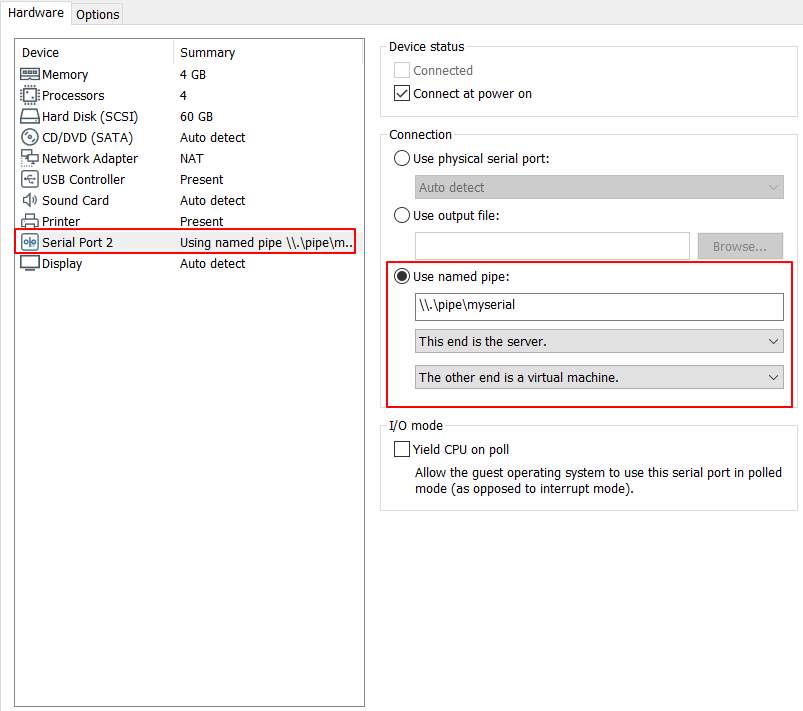 要使用 VMWare 模擬 Serial Port,並將兩台虛擬機的 Serial Port 連接起來,需要各別新增一個 Serial Port,並設定相同使用的 named pipe,一主一副即可。