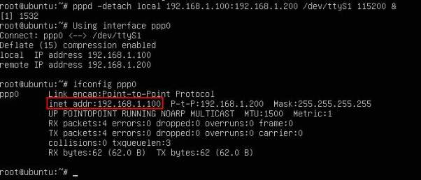 pppd -detach local 192.168.1.200:192.168.1.100 /dev/ttyS1 115200 & |