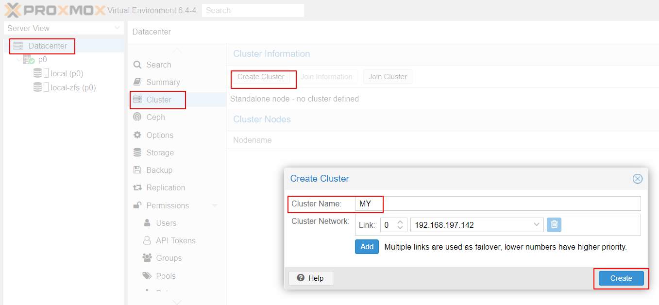 首先先用瀏覽器打開3個 Proxmox 的管理網頁,然後從 p0 的頁面進行 Cluster 的創建。選擇 DataCenter –> Cluster –> Create Cluster –> Create。