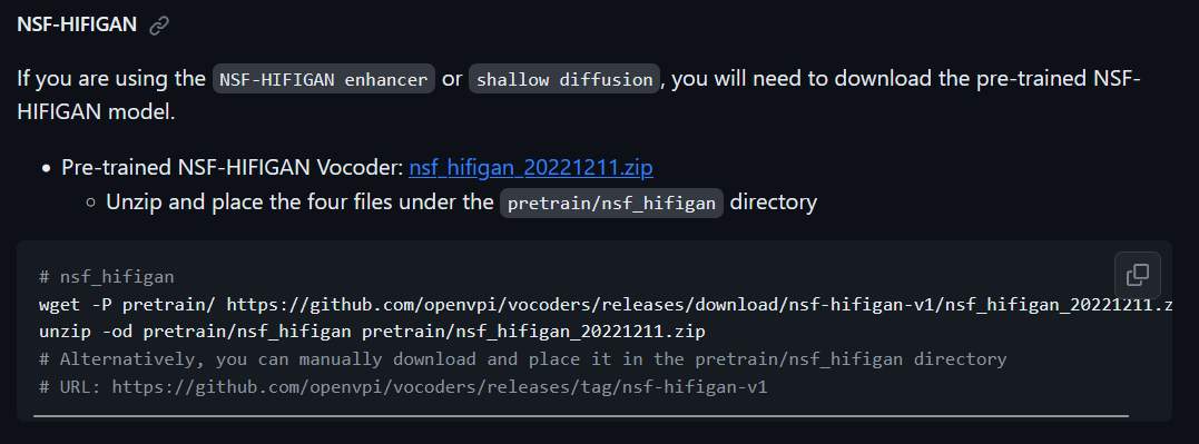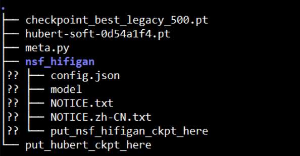 After downloading, vec768l12 is placed in the pretrain directory. NFS-HIFIGAN is decompressed and placed in the pretrain directory. Its directory structure is as follows.