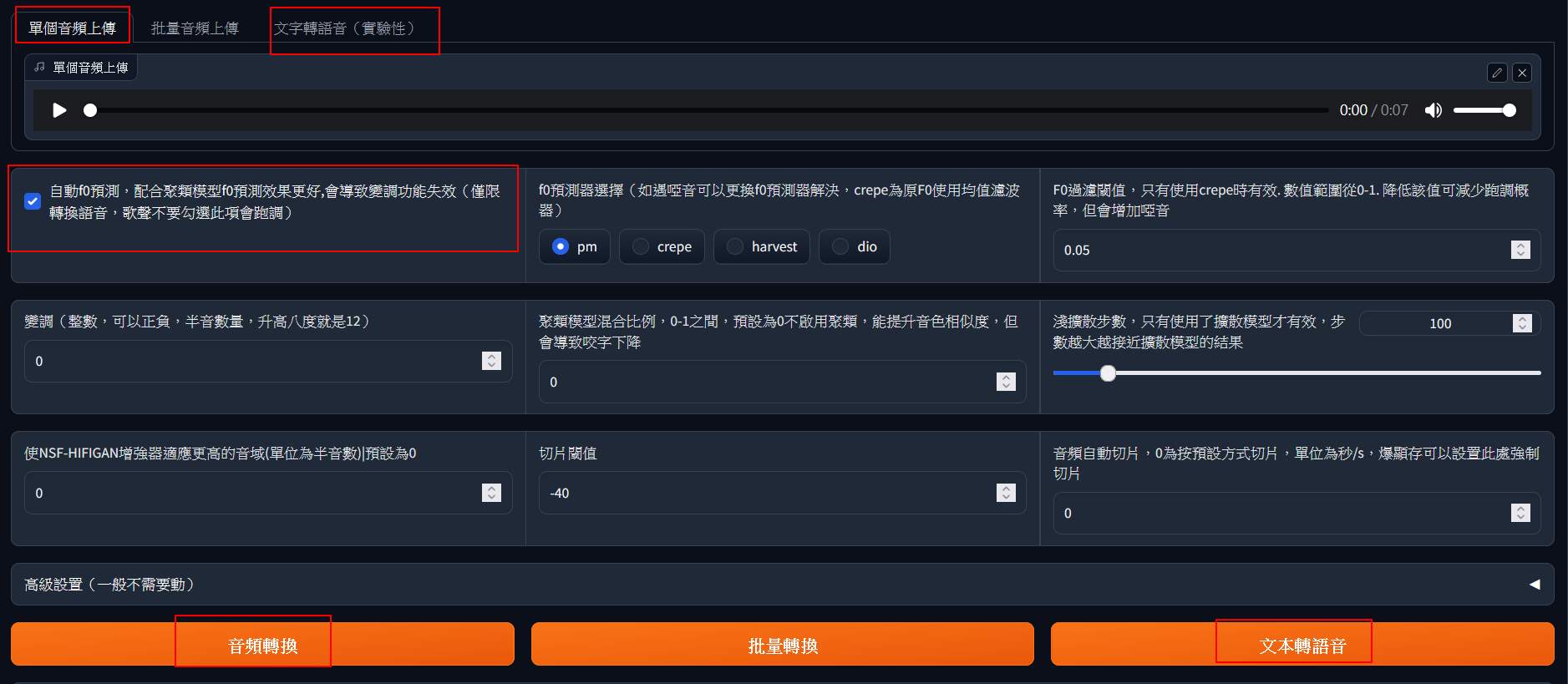 After loading the model, you can use file uploads for cloning or directly convert the text TTS. This time, we need to select the “automatic f0 prediction.” If it is not for singing, you need to select it, otherwise, it will appear as electronic music.