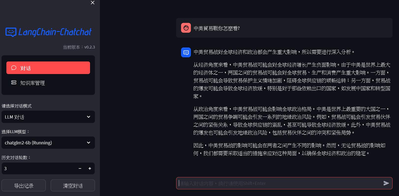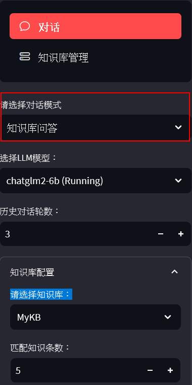 On the left, you can choose to use a conversational mode, including LLM conversation (like chatGPT), knowledge base QA, or search engine. The number of historical dialogue rounds refers to the number of previous questions and answers that it will reference. On the right is the question and answer area.