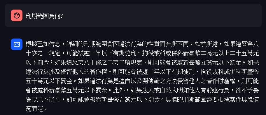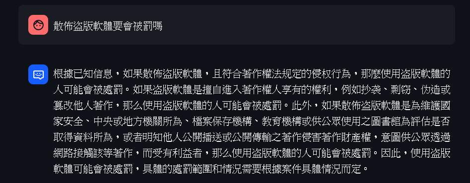 I asked “Will I be punished for distributing pirated software?” and “What is the range of possible sentences?”, and he spoke knowledgeably about it. After carefully reading one of them, I found out that it was indeed correct!