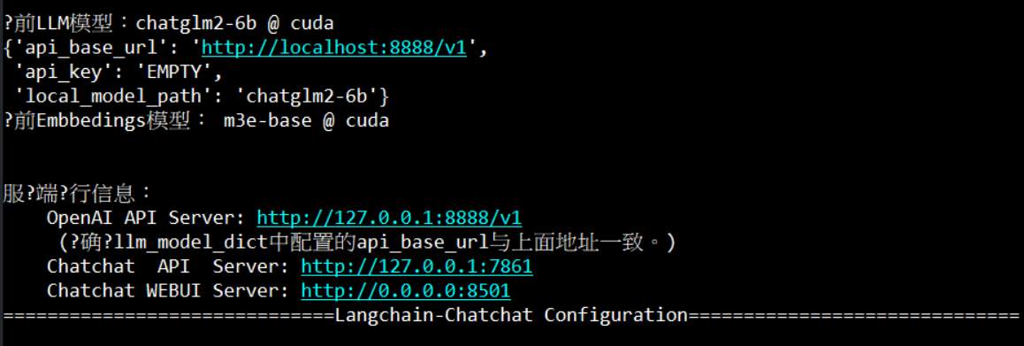 The diff file looks a bit messy. In model_config.py, only m3e-base and llm_model_dict only retain chatglm2-6b in embedding_model_dict. While in server_config.py, it allows connections from external machines.